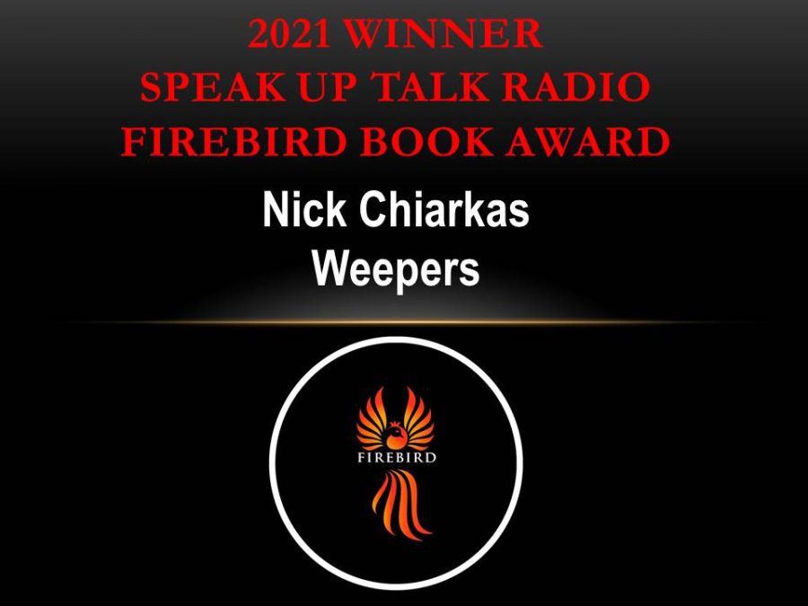 Nick Chiarkas Firebird Book Award Winner Weepers, by Nocholas Chiarkas, won First Place in the Thriller, Mystery, Young Adult, and Cross-GenreĀ Second Place in the Crime Fiction for the Firebird Book January 20, 2022